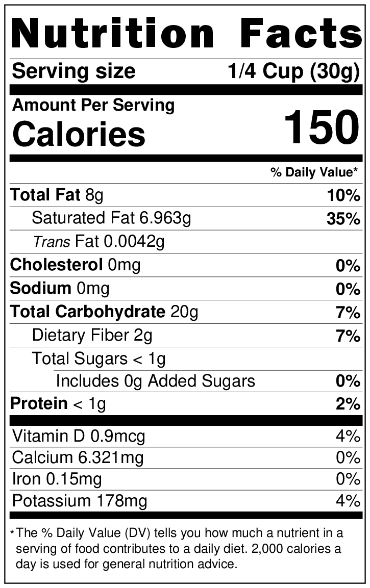 Allergen Statement: Product packed in a facility that also handles nuts, peanuts, soy, sesame, and wheat. 8 oz and 2 lb sizes only.