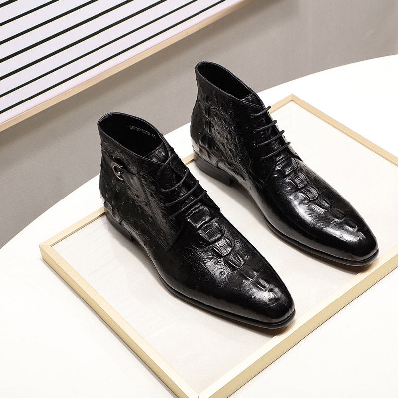 Style: Crocodile pattern embossed men's lace-up nude boots