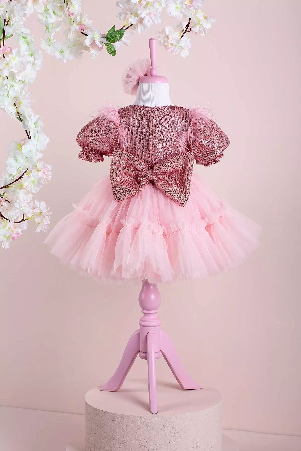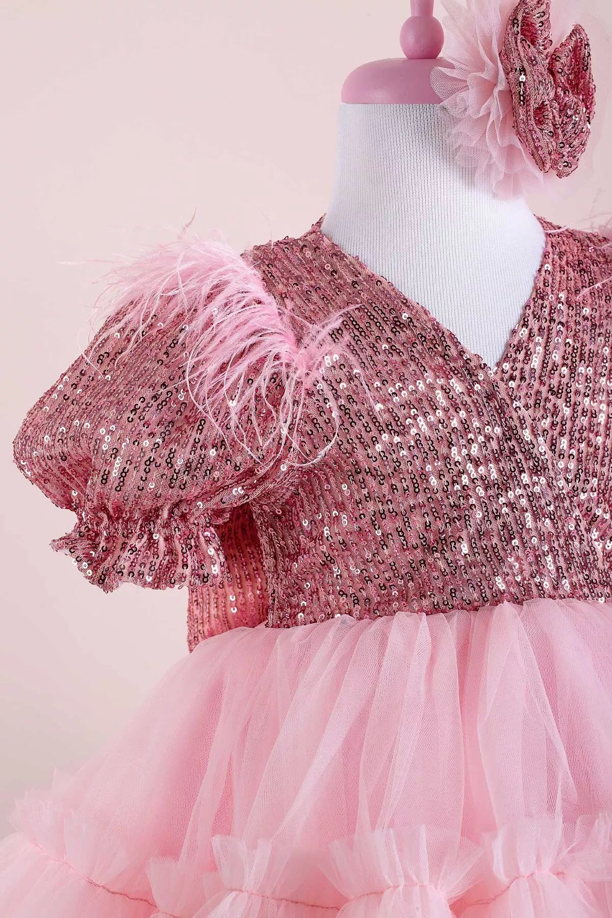The sequins adorning the upper part reach up to the sleeves. Right on the shoulders, there are light touches of feathers! You will see the sewing details that add movement to the dress in the fluffy layered tulle skirt part. A great party dress where the lights are reflected and radiant to the surroundings!