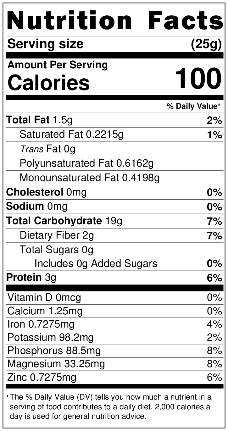 Allergen Statement: Product packed in a facility that also handles nuts, peanuts, soy, sesame, and wheat. 1 lb and 5 lb sizes only.