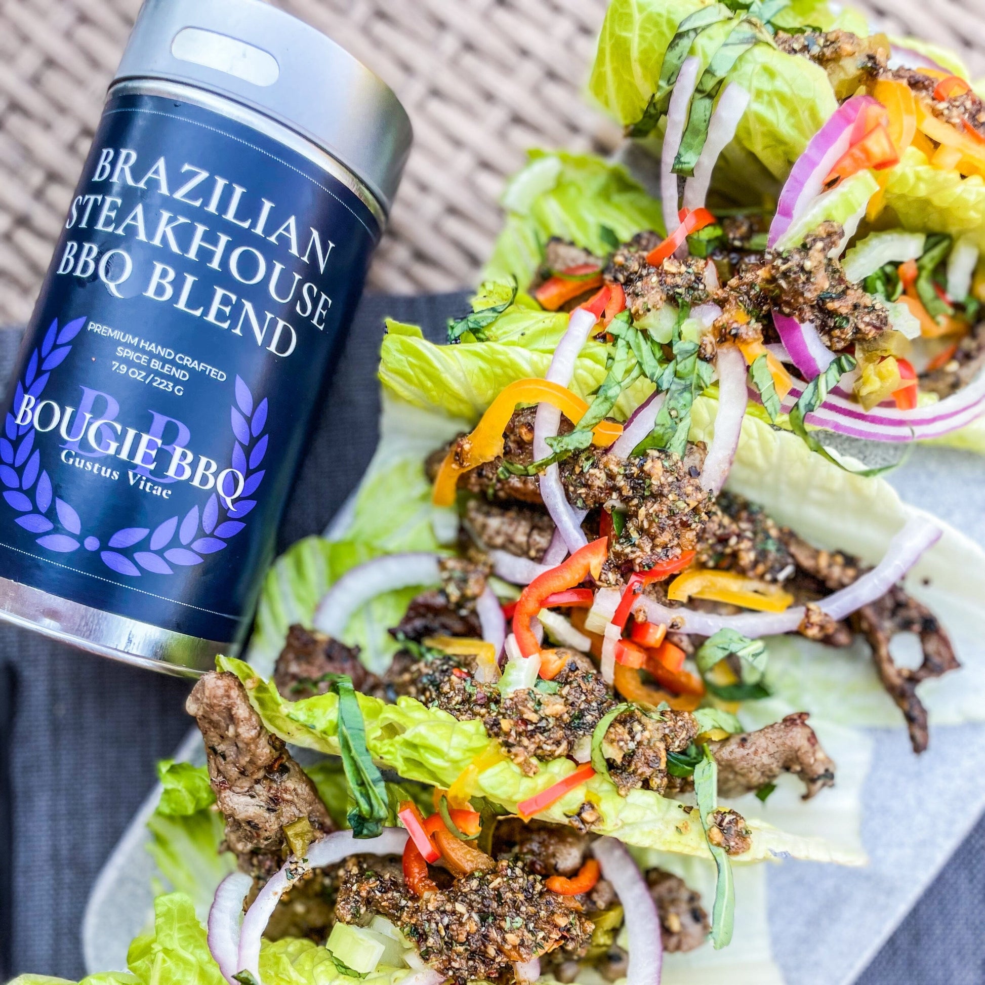 - Brazilian Steakhouse BBQ Blend: Granulated Garlic, Minced Garlic, Sea Salt, Cane Sugar, Black Pepper, Ginger, Cinnamon, Cilantro, Oregano, Cayenne Pepper, Red Pepper Flakes, Green Bell Pepper, Oregano.