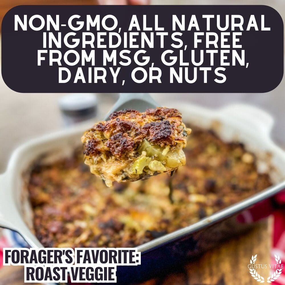Forager's Favorite: Roasted Veggie Seasoning Contains: Celery Seed, Black Pepper, Caraway Seed, Bay Leaves, Sea Salt, Thyme, Savory, Marjoram, Basil, Paprika, Onions, Garlic,, Sugar, Arrowroot Powder, Parsley and Dill Tips.