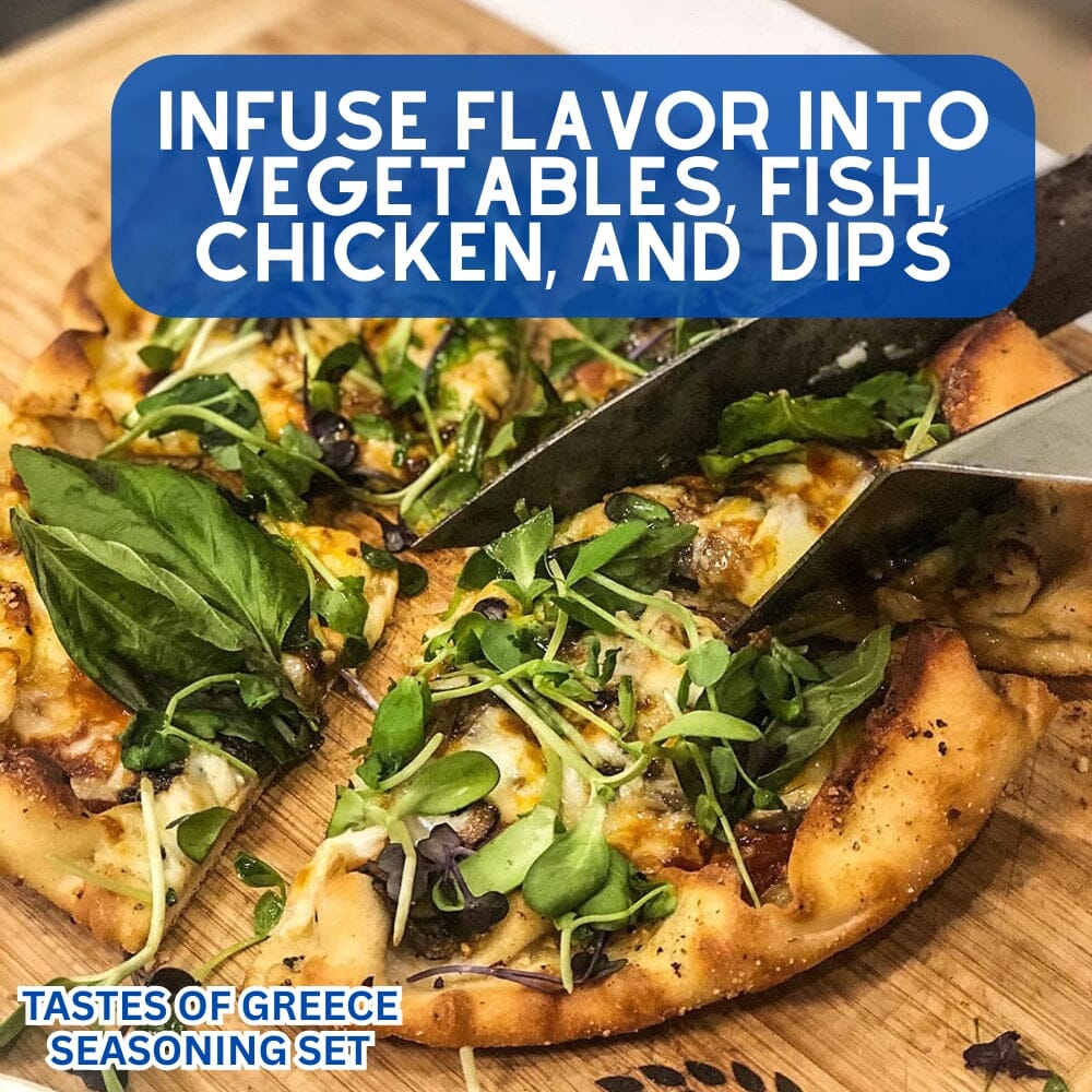 - Taste Greece Seasoning Contains: Garlic Powder, Black Pepper, Salt, Oregano, Lemon Oil, Marjoram.