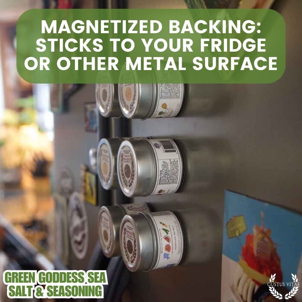 Green Goddess has long been our go-to for salad dressings, so it was only a matter of time before we decided we needed to distill one of our favorite flavors into a gourmet seasoning salt. Richly herbaceous, with a satisfying tang from the sour cream, this is one of those seasonings that we find ourselves putting on everything. Sure, it's prefect for a instant dip when mixed with sour cream, cottage cheese, or greek yogurt, and of course it's wonderful for adding zesty flavors to light summer salads - just drizzle a little olive oil and a sprinkle of Green Goddess seasoning before serving an enjoy a perfect dressing without the heaviness or calories of traditional salad dressing. We love this seasoning on twice-baked potatoes, oven roasted veggies, and it's our secret ingredient for cauliflower puree that will have your guests coming back for 3rds and 4ths - we've learned to always make extra! Magnetized backing: tins sticks to your fridge or other metal surface.