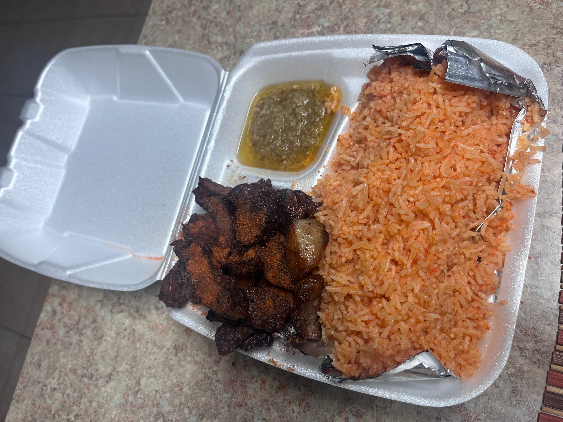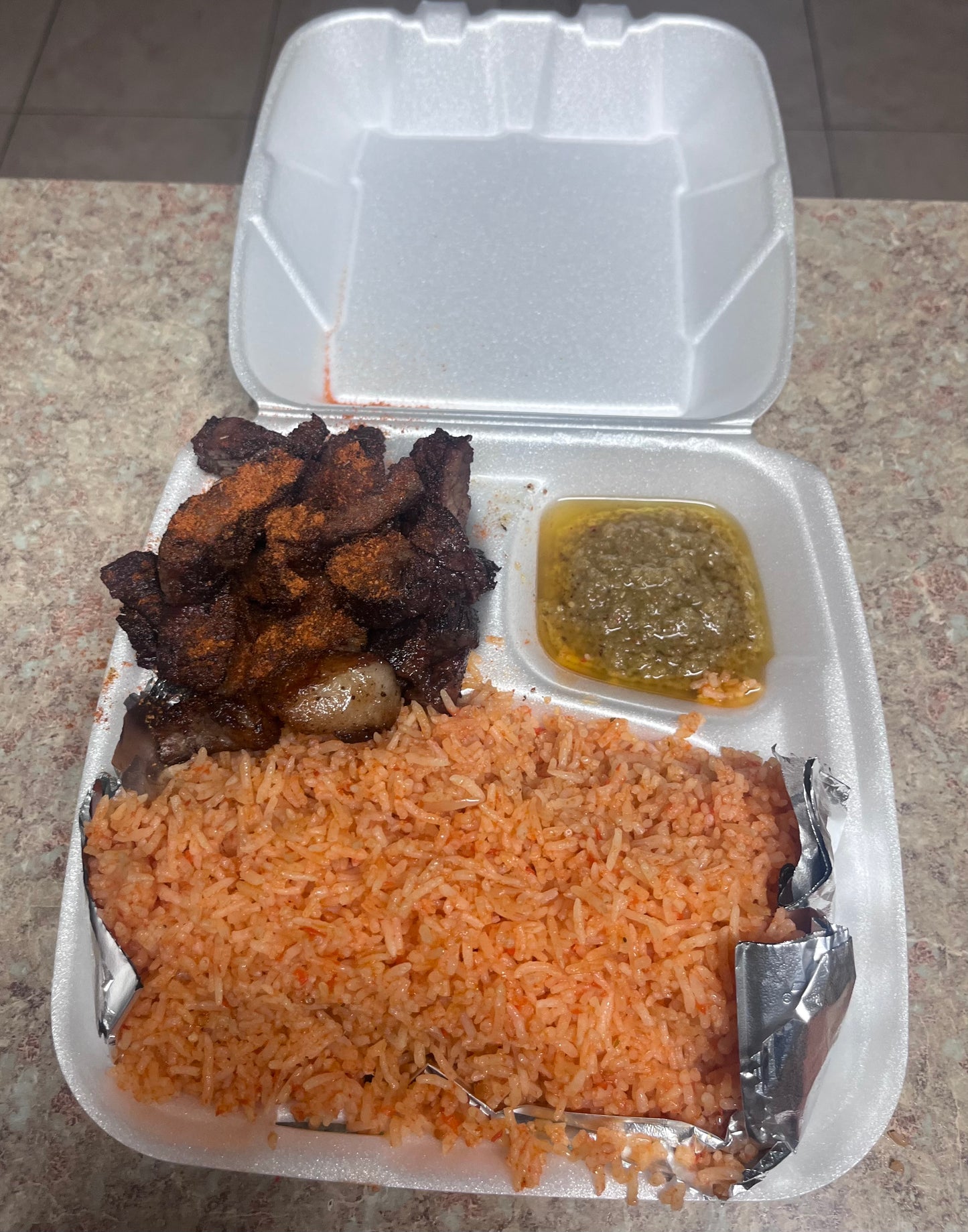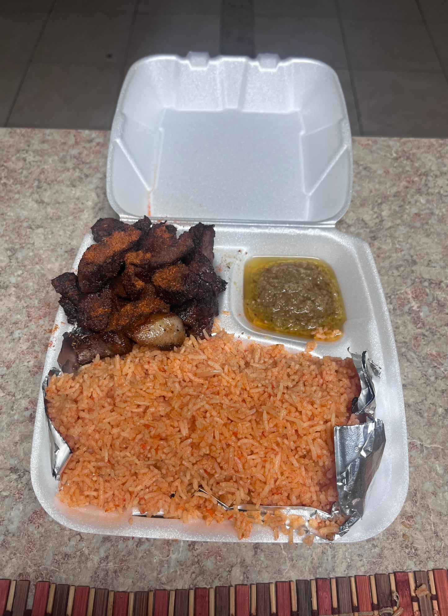 This flavorful dish consists of a hearty serving of Jollof rice, a spicy and savory Nigerian staple, paired with tender cuts of beef suya. With its perfect blend of spices and textures, this dish is sure to satisfy your cravings and transport you to the streets of West Africa.