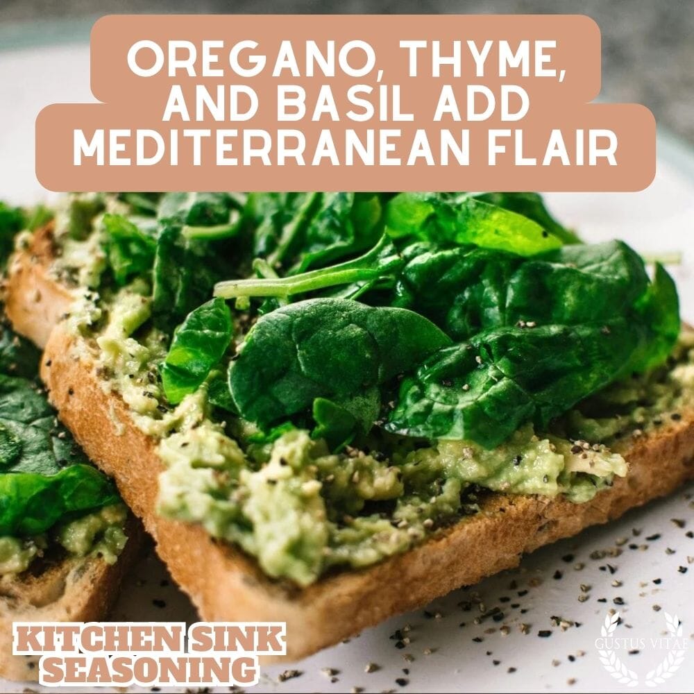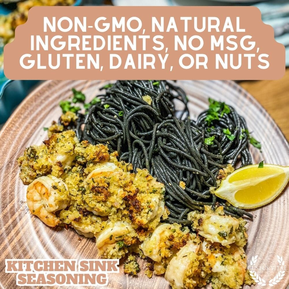 Kitchen Sink Seasoning Contains: Sea Salt, Minced Garlic, Onion, Sugar, Dill Tips, Chives, Basil, Chervil, Tarragon, White Pepper, Parsley, Black Pepper, Red Bell Pepper, Sesame Seeds, Poppy Seeds, Oregano, Thyme, Ground Celery Seed, Red Pepper, Paprika, Hickory Smoke Powder, Spanish Paprika, Cayenne, Basil Leaves, Rosemary.