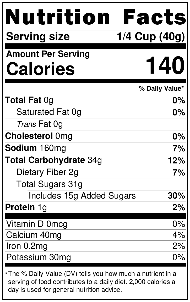 Allergen Statement: Product packed in a facility that also handles nuts, peanuts, soy, sesame, and wheat. 8 oz and 2 lb sizes only.