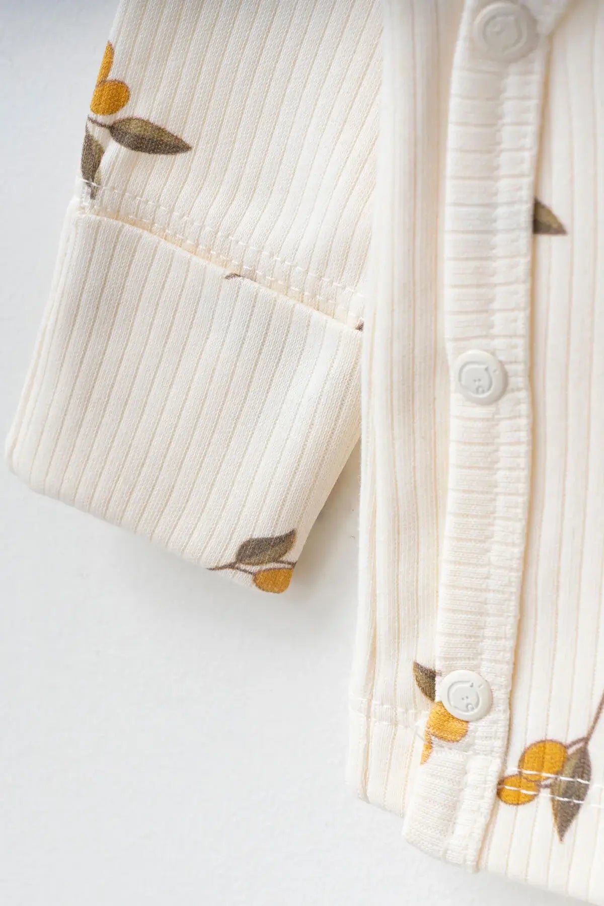 This adorable Baby Clothes Set is crafted from soft, breathable cotton, making it the perfect choice for your little one's delicate skin. The set includes a long-sleeve top, footed pants, and a matching hat, all featuring a charming, nature-inspired print. The easy-to-snap buttons on the top and the stretchy waistband of the pants ensure a snug and comfortable fit, making it ideal for everyday wear or special outings.