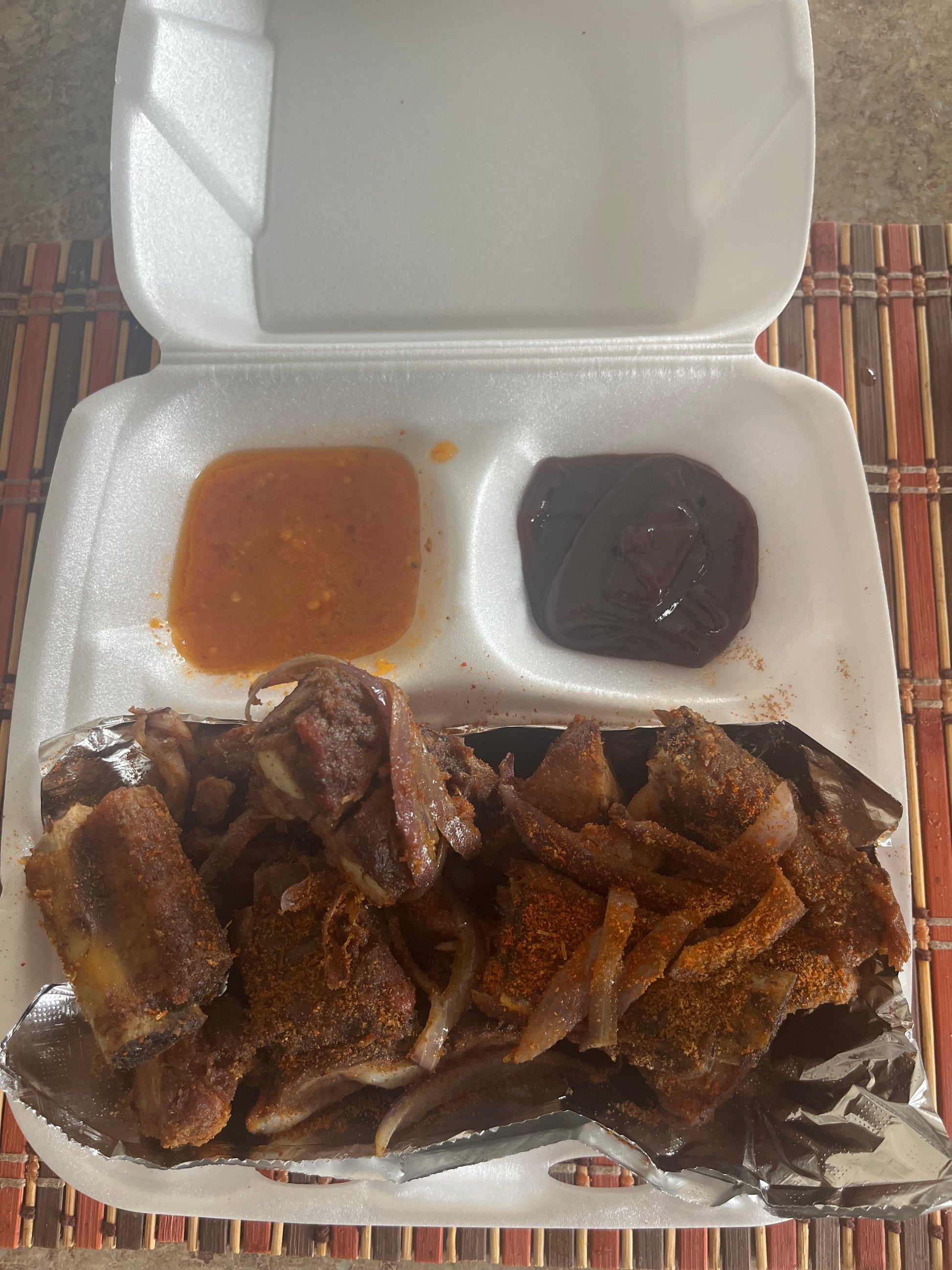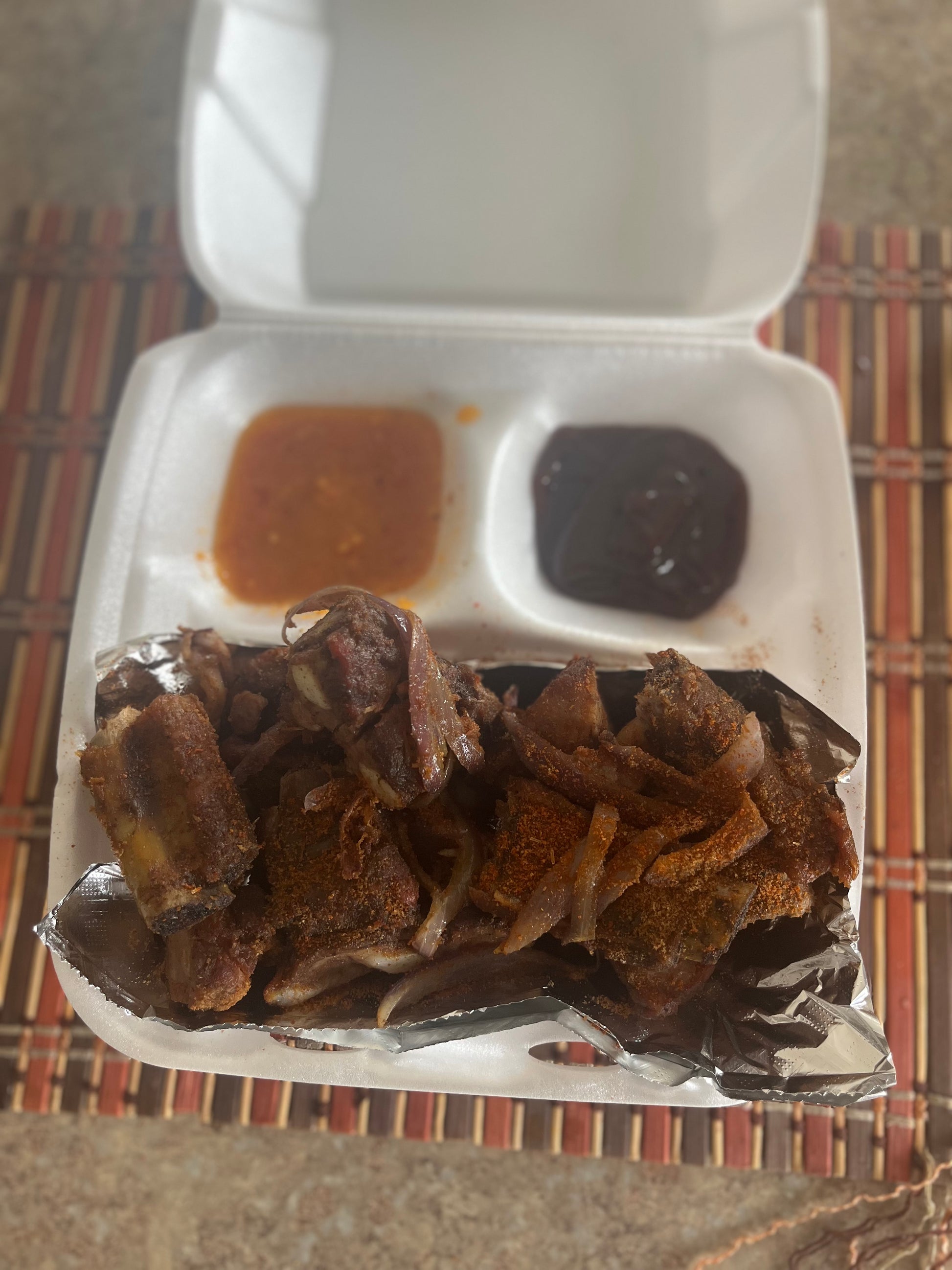 Indulge in the best street food experience with Pork Suya! Juicy pork pieces marinated in authentic West African spices and roasted to perfection. Served with a tantalizing blend of spicy hot sauce and sweet honey bbq sauce, this delicacy will leave your taste buds craving for more!