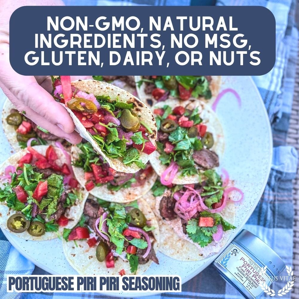 Portuguese Piri Piri Fire Seasoning Contains: Paprika, Granulated Garlic, Minced Garlic, Sugar, Fine Salt, Coarse Salt, Granulated Onion, Minced Onion, Red Cayenne, Black Pepper, Oregano, Red Pepper Flakes, Bell Pepper, Ginger, Orange Peel, Basil, Bay Leaves.