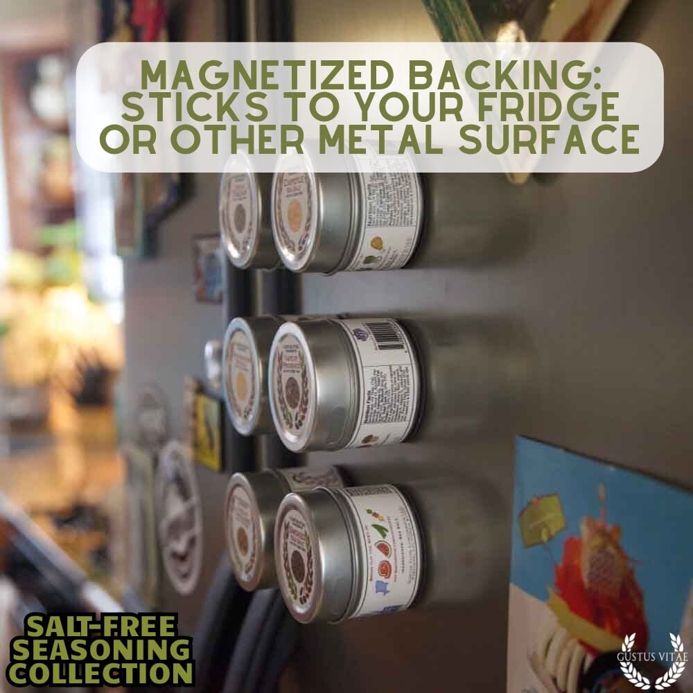 Our 6 piece salt-free gourmet seasoning collection includes six of our most popular salt-free seasonings and spice/herb blends (Taste of California, Taste of Bordeaux, Taste of Provence, Crushed Red Pepper Flakes, Taste of Thailand, Taste of Tuscany). Our unique magnetic tins offer myriad display & storage options (like sticking to your fridge, oven, BBQ, or microwave), so that any part of the kitchen can be transformed into your own salt-free seasoning pantry.