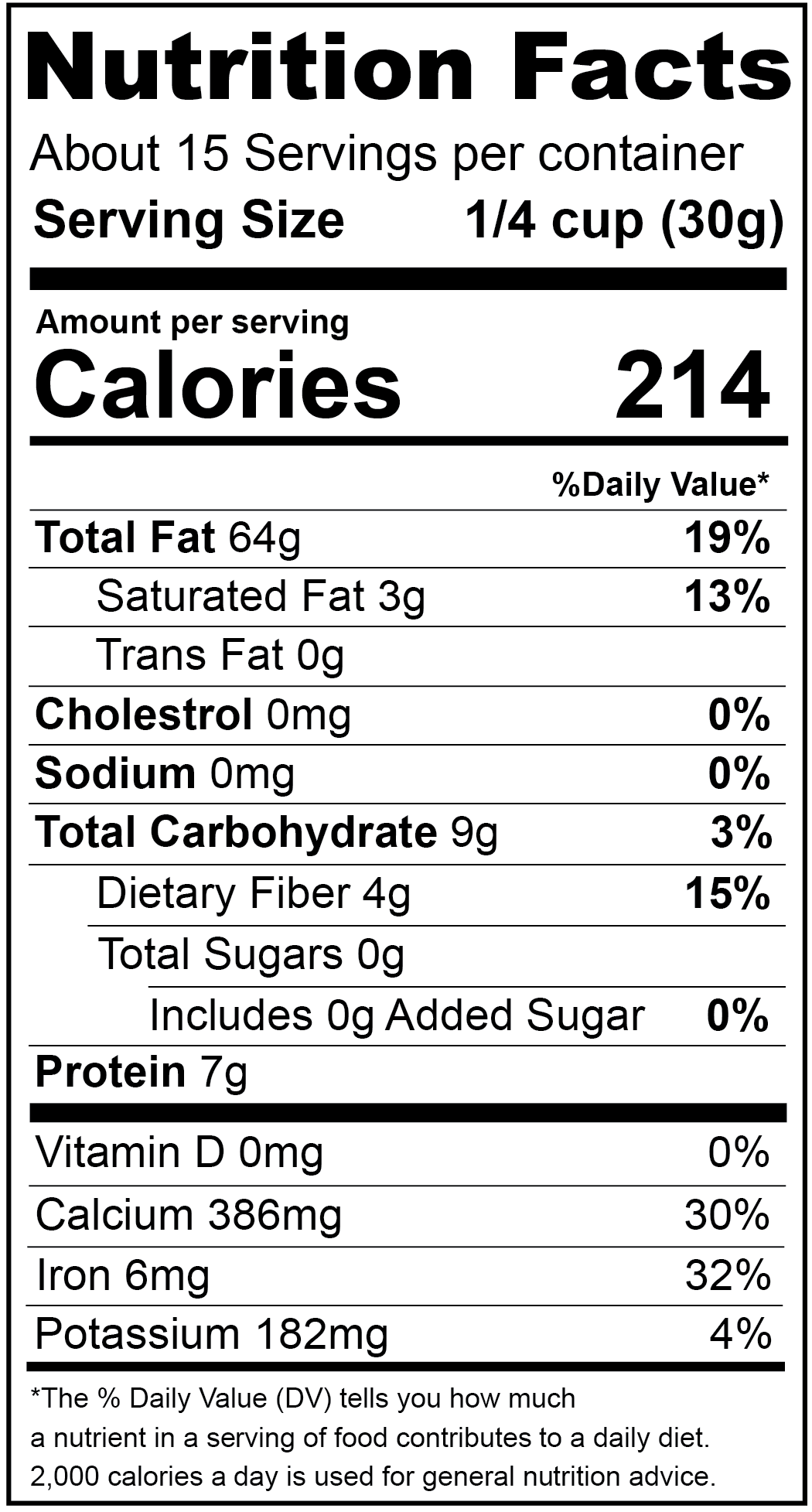 Allergen Statement: Product packed in a facility that also handles nuts, peanuts, soy, sesame, and wheat. 1 lb and 5 lb sizes only.