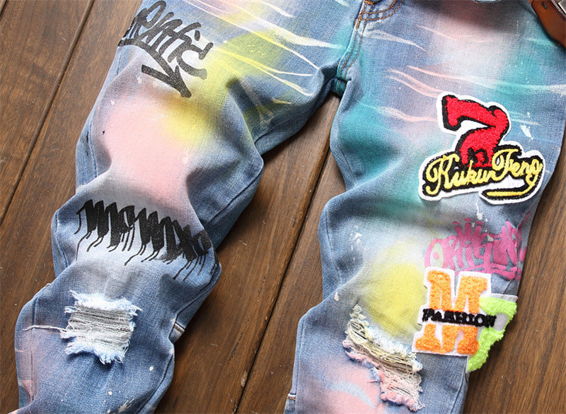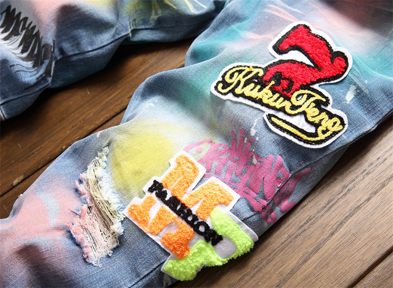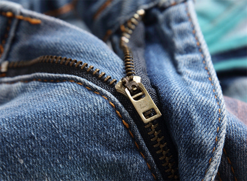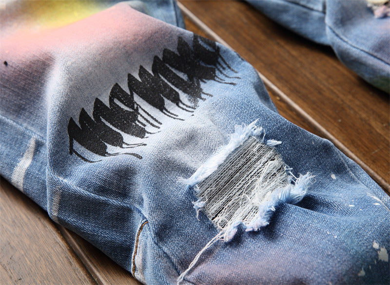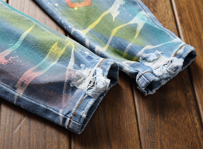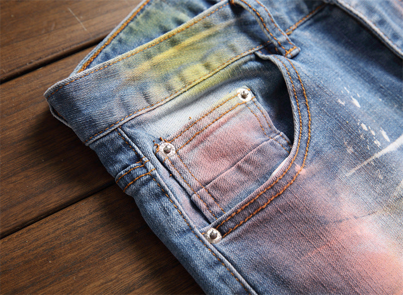 Shredded Patch Blue Painted Men's Stretch Jeans