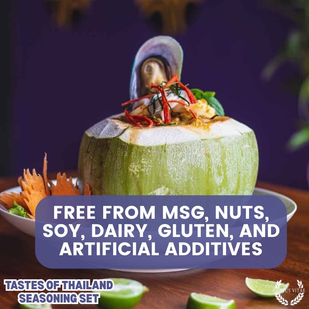- Spicy Thai Seasoning: California Sea Salt, Ginger, Basil, Red Pepper, Cumin, Cardamom, Black Pepper, Garlic, Onion, Red Bell Peppers, Cilantro, Turmeric Extract and Garlic Oil.