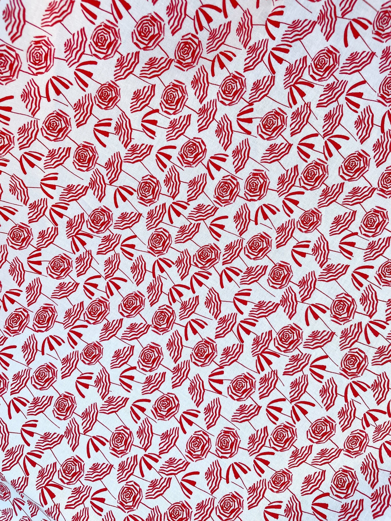 A vintage style piece with fun, modern details; our midi dress is now available in our umbrella print. Made from 100% cotton, this classic 1950's inspired dress features a high neckline, longer length swing skirt with hidden side pockets, and back zippered closure. Shown with the retro style cinch belt in red.