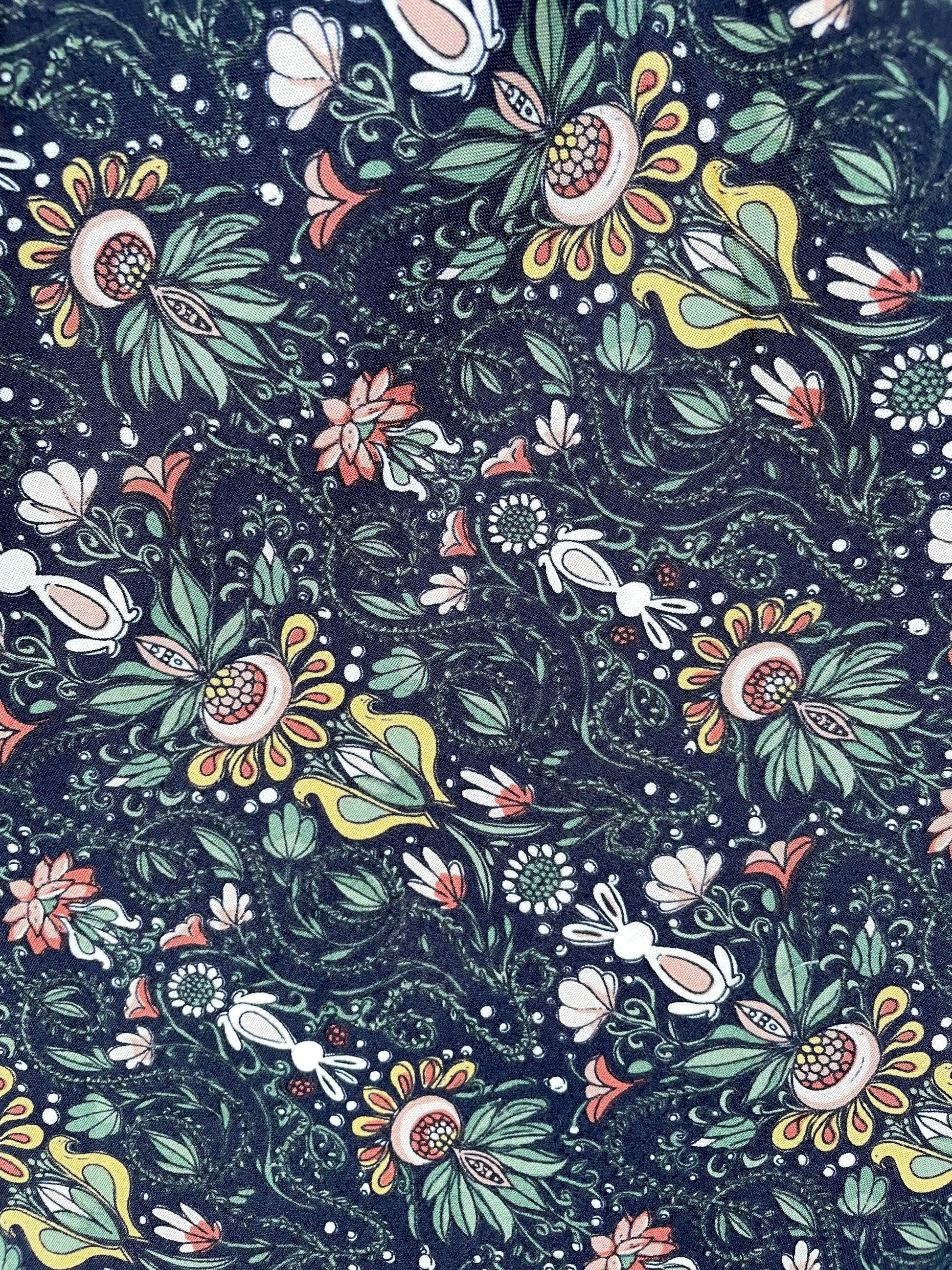A vintage style piece with fun, modern details; our midi dress is now available in our White Rabbit print. Made from 100% cotton, this classic 1950's inspired dress features a high neckline, longer length swing skirt with hidden side pockets, and back zippered closure. Shown with our mustard retro cinch belt.
